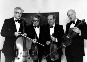 Because of their Jewish origin, the violinists Norbert Brainin (12 March 1923 – 10 April 2005), Siegmund Nissel (3 January 1922 – 21 May 2008) and Peter Schidlof (9 July 1922 – 16 August 1987; later violist) were driven out of Vienna after Hitler’s Anschluss of 1938. Brainin and Schidlof met in a British internment camp at Prees Heath before being transferred to the Isle of Man; many Jewish refugees were confined by the British as “enemy aliens” upon seeking refuge in the UK. Brainin was released after a few months, but Schidlof remained in the camp, where he met Nissel. Finally Schidlof and Nissel were released, and the three of them were able to study with violin teacher Max Rostal, who taught them free of charge. It was through Rostal that they met cellist Martin Lovett (3 March 1927 – 29 April 2020), and in 1947 they formed the Brainin Quartet, which was renamed the Amadeus Quartet in 1948.